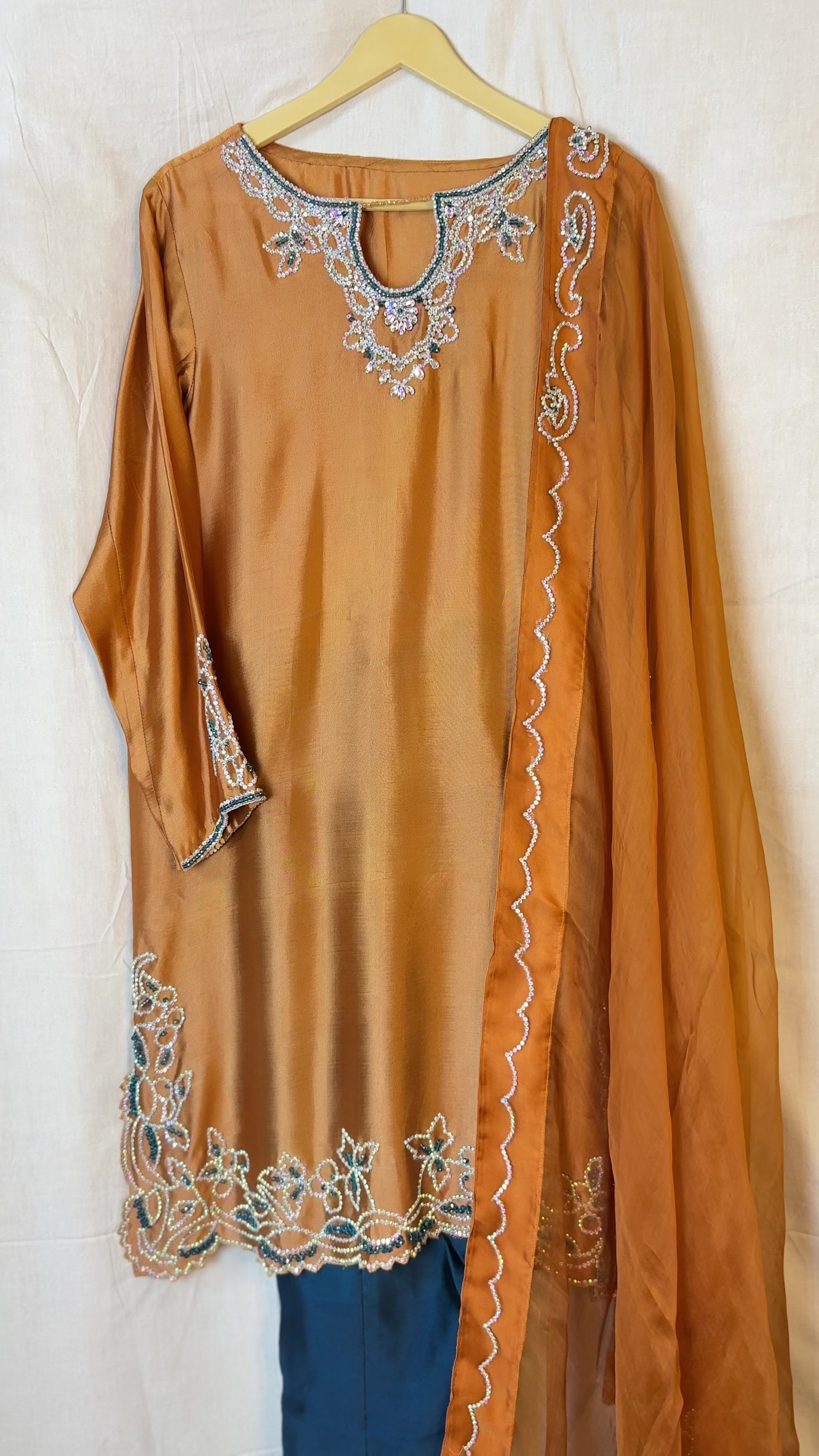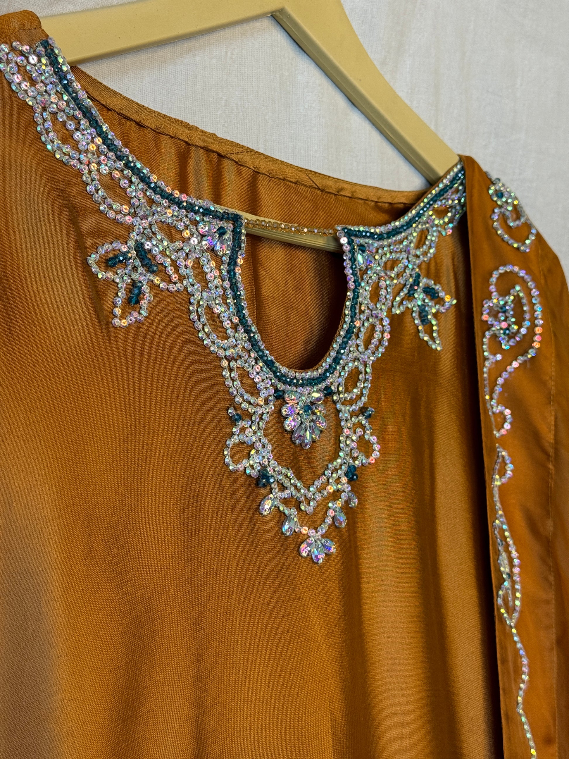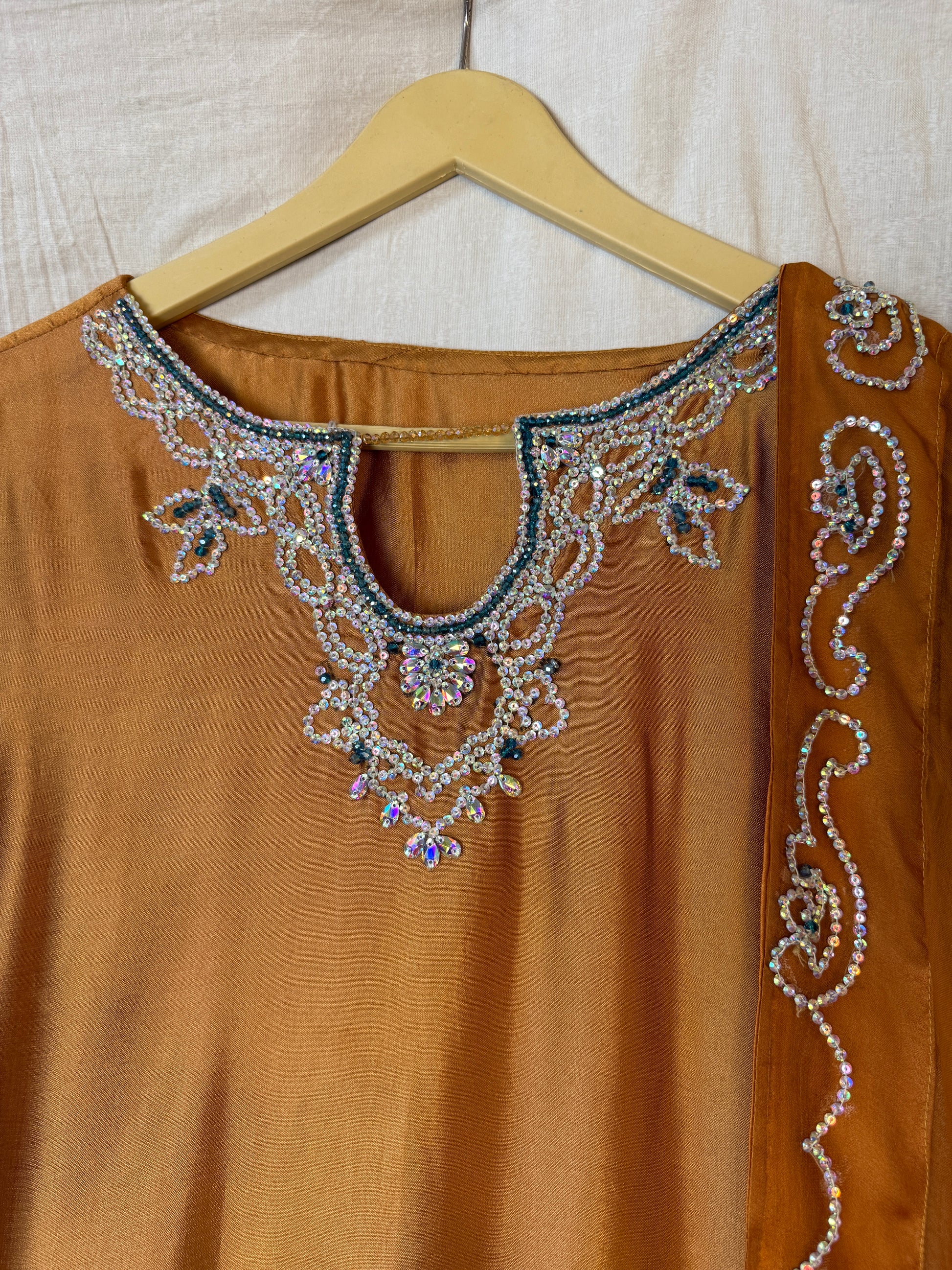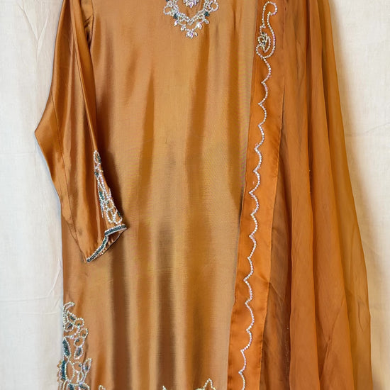 ZARNIGAR - 3pcs Mustard Shirt with a Farsi Shalwar and dupatta is our most delicate piece of work.